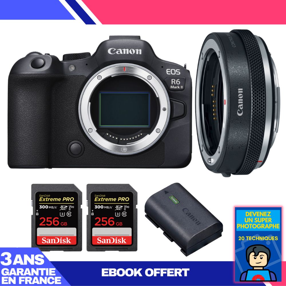 Boitier Canon EOS R6 Mark II + Canon EF-EOS R Premium + 2 SanDisk 256GB Extreme PRO UHS-II SDXC 300 MB/s + 3 Canon LP-E6NH + Ebook 'Devenez Un Super Photographe