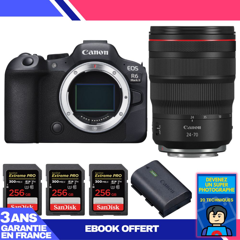 Boitier Canon EOS R6 Mark II + RF 24-70mm f/2.8 L IS USM + 3 SanDisk 256GB Extreme PRO UHS-II SDXC 300 MB/s + 2 Canon LP-E6NH + Ebook 'Devenez Un Super Photographe