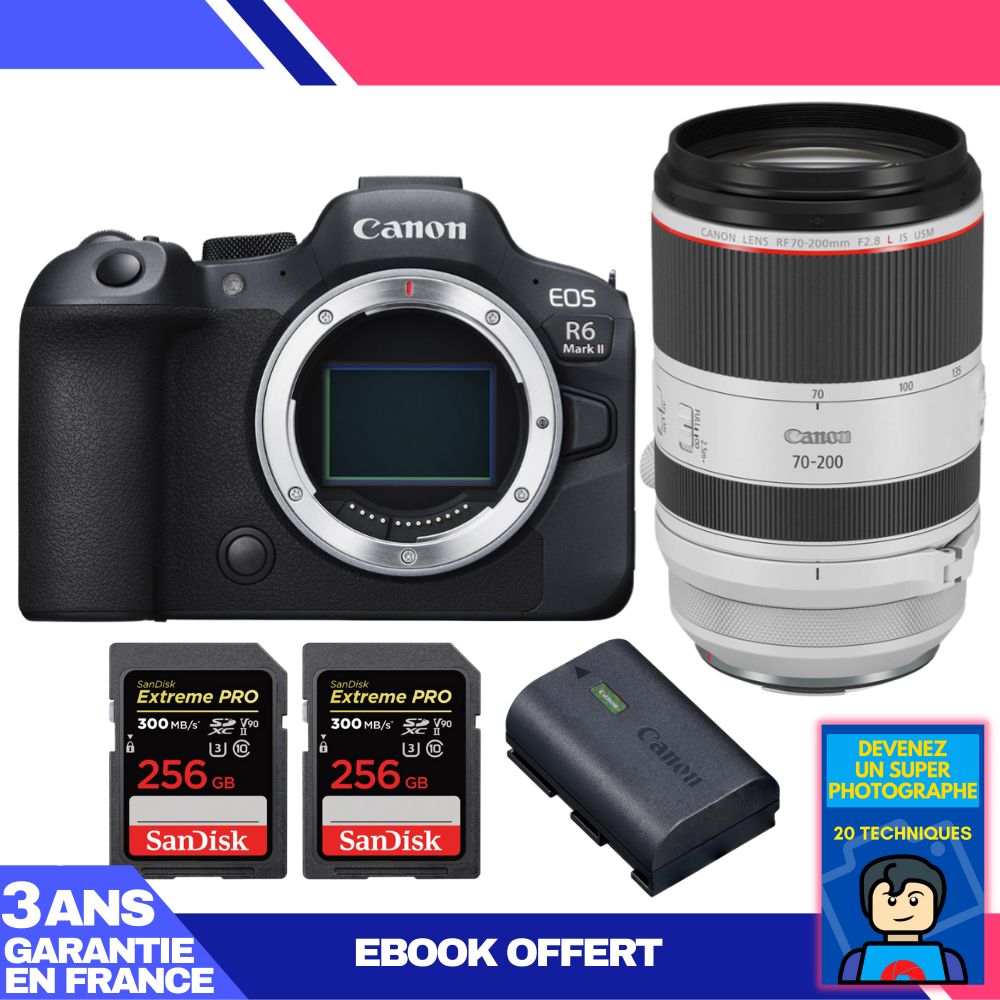 Boitier Canon EOS R6 Mark II + RF 70-200mm f/2.8 L IS USM + 3 SanDisk 256GB Extreme PRO UHS-II SDXC 300 MB/s + 2 Canon LP-E6NH + Ebook 'Devenez Un Super Photographe