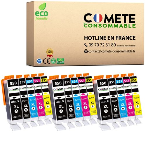 COMETE CONSOMMABLE 550 551 XL - Pack de 15 Cartouches d'encre compatibles avec CANON PGI-550 CLI-551 XL PGI550 CLI551 XL 550XL 551XL 6 Noir + 3 Cyan + 3 Magenta + 3 Jaune