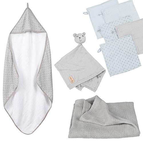 roba Coffret Sortie de Bain Bébé Lil Planet - 1 Cape de Bain + 5 Gants de Toilette + 1 Serviette Doudou + 1 Couverture - Certifié GOTS et OEKO-TEX - Gris Argenté