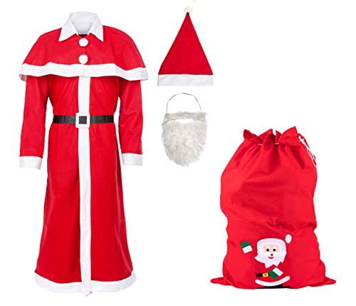 Idena 8580108 - Ensemble de déguisement de Père Noël ou Saint Nicolas, avec sac cadeau, bonnet, barbe, manteau, ceinture, cape, Rouge/Blanc, Taille Unique