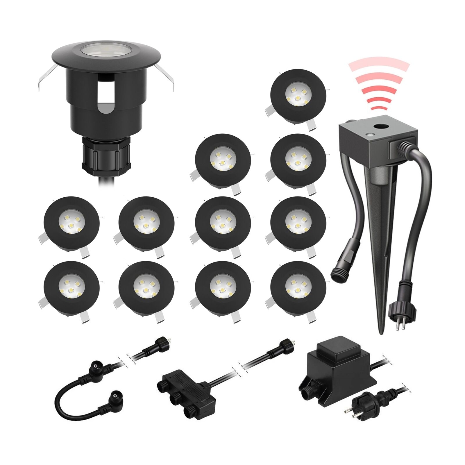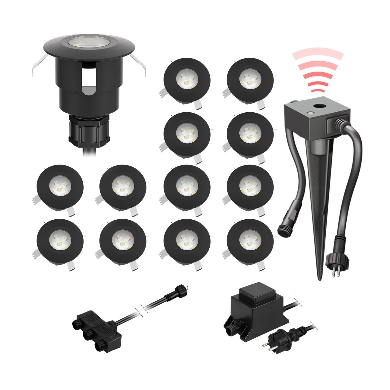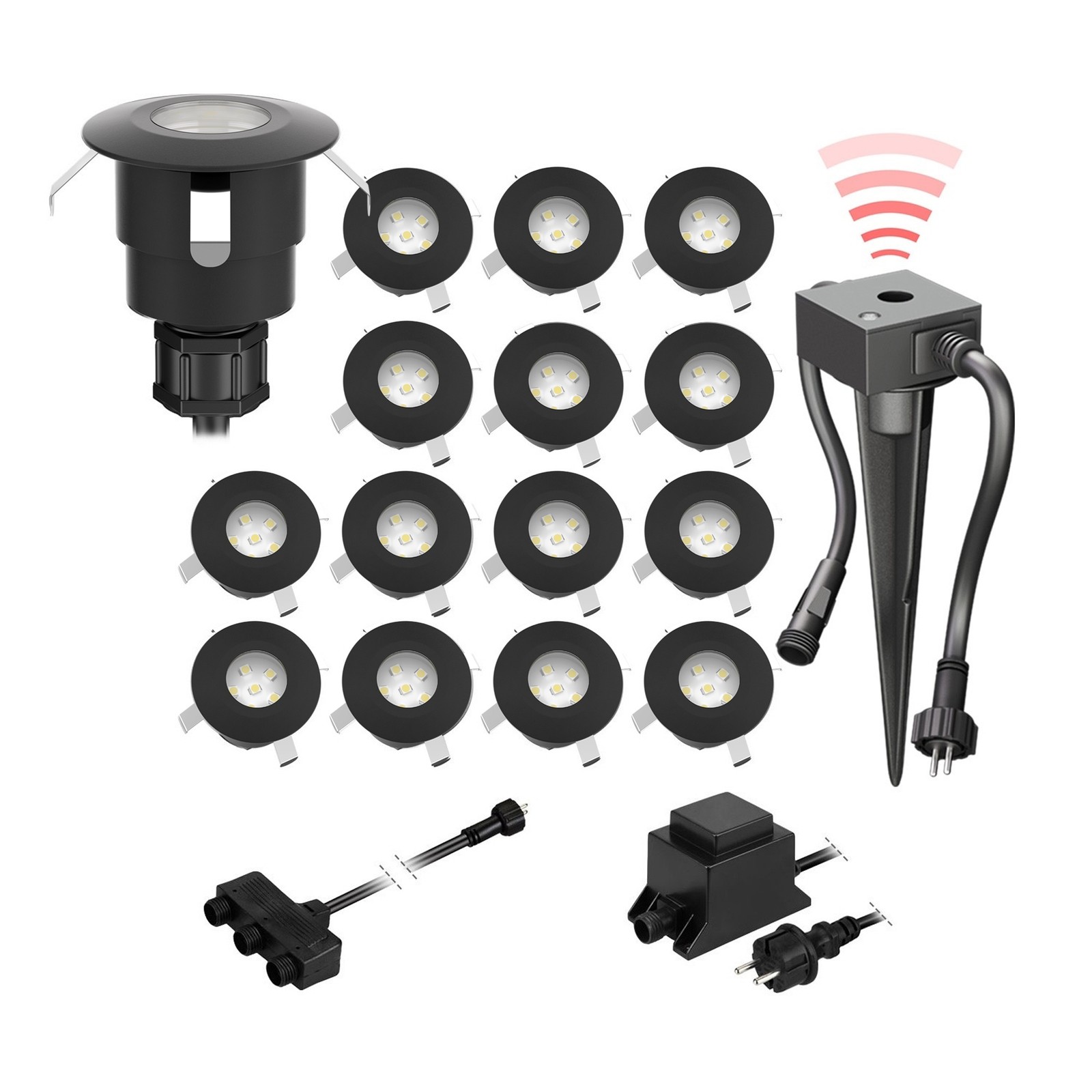 ledscom.de Lampe LED de sol en saillie Bunda, 4 flammes, avec capteur crépusculaire pour l'extérieur, noir, carrossable, blanc chaud, set de 14 pièces