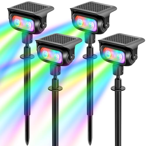 MEEKBOS Spot Solaire LED RGB Jardin 4 Pièces, 5 Modes Couleur avec Capteur Crépusculaire, Projecteur Solaire Extérieur IP65 Étanche sur Piquet pour Éclairage de Jardin, Pelouse et Allée