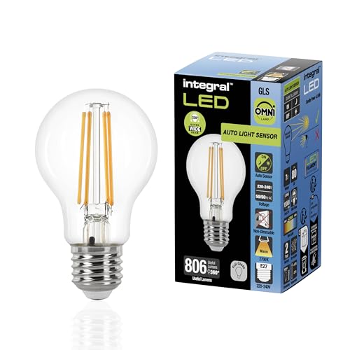 Integral Ampoule à Omni-filament E27 LED GLS non-dimmable à double capteur crépusculaire - Blanc chaud 2700K, 806lm, 7W (équivalent 60W) - Basse consommatiomn et idéale pour l'extérieur
