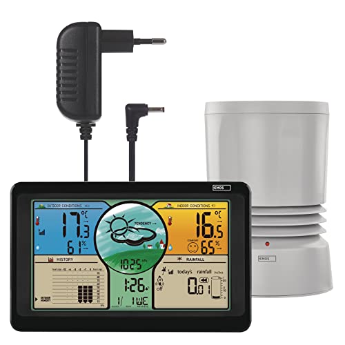 EMOS Station météo radio avec écran couleur, capteur extérieur dans le pluviomètre, température °C/°F, humidité, prévisions météorologiques, lectures max/min, horloge radio 12/24h, calendrier