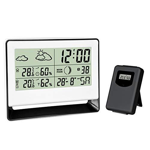 MEBUS Station météo radio-pilotée avec capteur extérieur, thermomètre/hygromètre, horloge radio-pilotée, indicateur de bien-être climat intérieur, prévisions météo, calendrier lunaire, réveil,