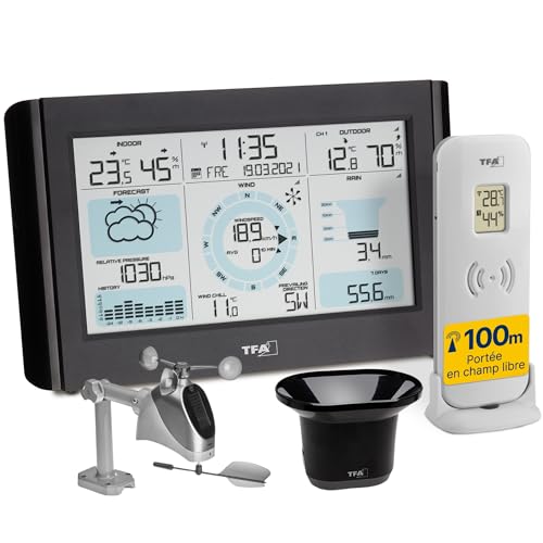 TFA Dostmann Weather Pro Station météo sans fil, 35.1161.01, avec anémomètre, pluviomètre, capteur extérieur, prévisions météo avec symboles, température int./ext., numérique, noir