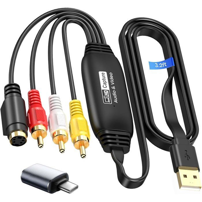 Ausi Adaptateur de carte de capture vidéo RCA AV vers USB-C, convertisseur S-Vidéo composite vers USB pour magnétoscope VHS DVD vers PC Mac
