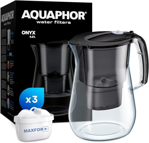 AQUAPHOR Carafe filtrante à eau Onyx de 4,2 L, pour réduire le calcaire, le chlore et autres impuretés, comprend 3 cartouches filtrantes Maxfor+ - Noir
