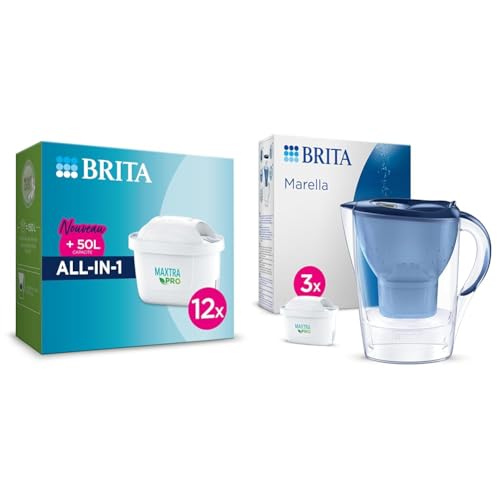 BRITA Pack de 12 cartouches filtrantes MAXTRA PRO All-in-1 - Nouveau MAXTRA + & Carafe filtrante Marella bleu (2,4L) inclus 3 cartouches filtrantes MAXTRA PRO All-in-1