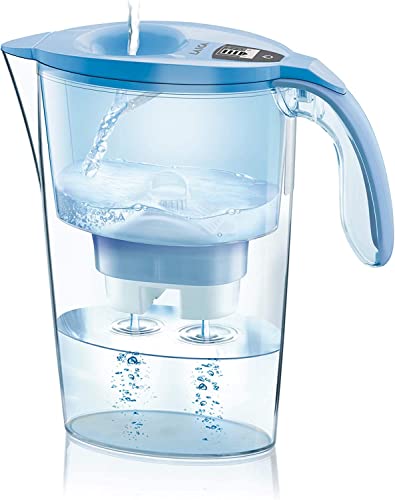 Wessper Carafe filtrante verre 3 l avec compteur de changement de filtre, carafe avec cartouches filtrantes d'eau potable BPA FREE, carafe verre avec filtre eau charbon actif – Bleu
