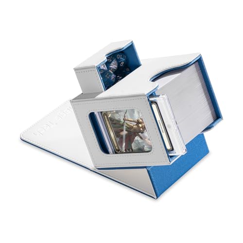 Mage Tech Card Deck Box for MTG Commander - Patented Design, Commander Display, Fits 100 Double-Sleeved Cards, 35pt Card Brick & Dice Tray - White/Blue