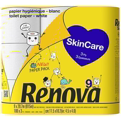 Renova Papier toilette SkinCare triple épaisseur - rouleau de 180 feuilles blanc paquet 9 rouleaux