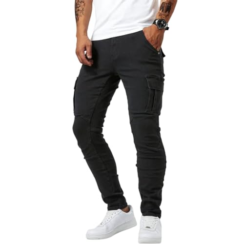 Jean Cargo URBANELITE, Jean URBANELITE, Jean Stretch Coupe Slim pour Homme, Pantalon Cargo en Denim à Poche à Rabat pour Homme (Noir,L)