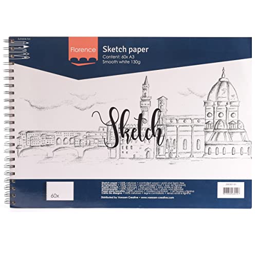 Florence Papier Dessin - A3 - 60 feuilles - 130 g/m² - Bloc de Papier pour Esquisses et Croquis - Carnet de Dessin - Sketchbook pour Crayon Graphite, Feutres et Marqueurs