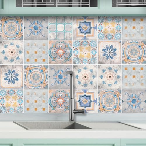 Stickers muraux Cuisine - Sticker Mural - Carreaux de Ciment adhésif Mural - Stickers Muraux azulejos - Sticker Carrelage adhesif Mural Salle de Bain 10x10cm - 24 pcs Carreau Ciment adhesif Palencia