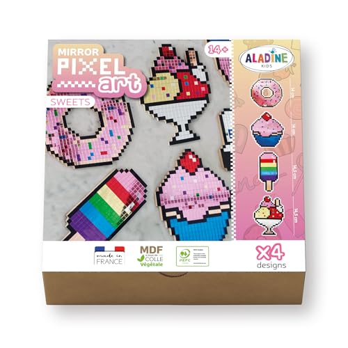 Aladine - Kit Pixel Art Sweets - Glace, Esquimau, Donut, Cupcake - 4 formes en Bois + Carreaux Adhésifs - 85613