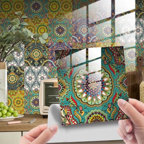 Ulticool - Stickers Imperméable Décoration Autocollants Carrelage - Mandala Vert Beige Bleu Rose - 15 x 15 cm - Lot de 15 pièces - Pour mur - salle de bain - cuisine