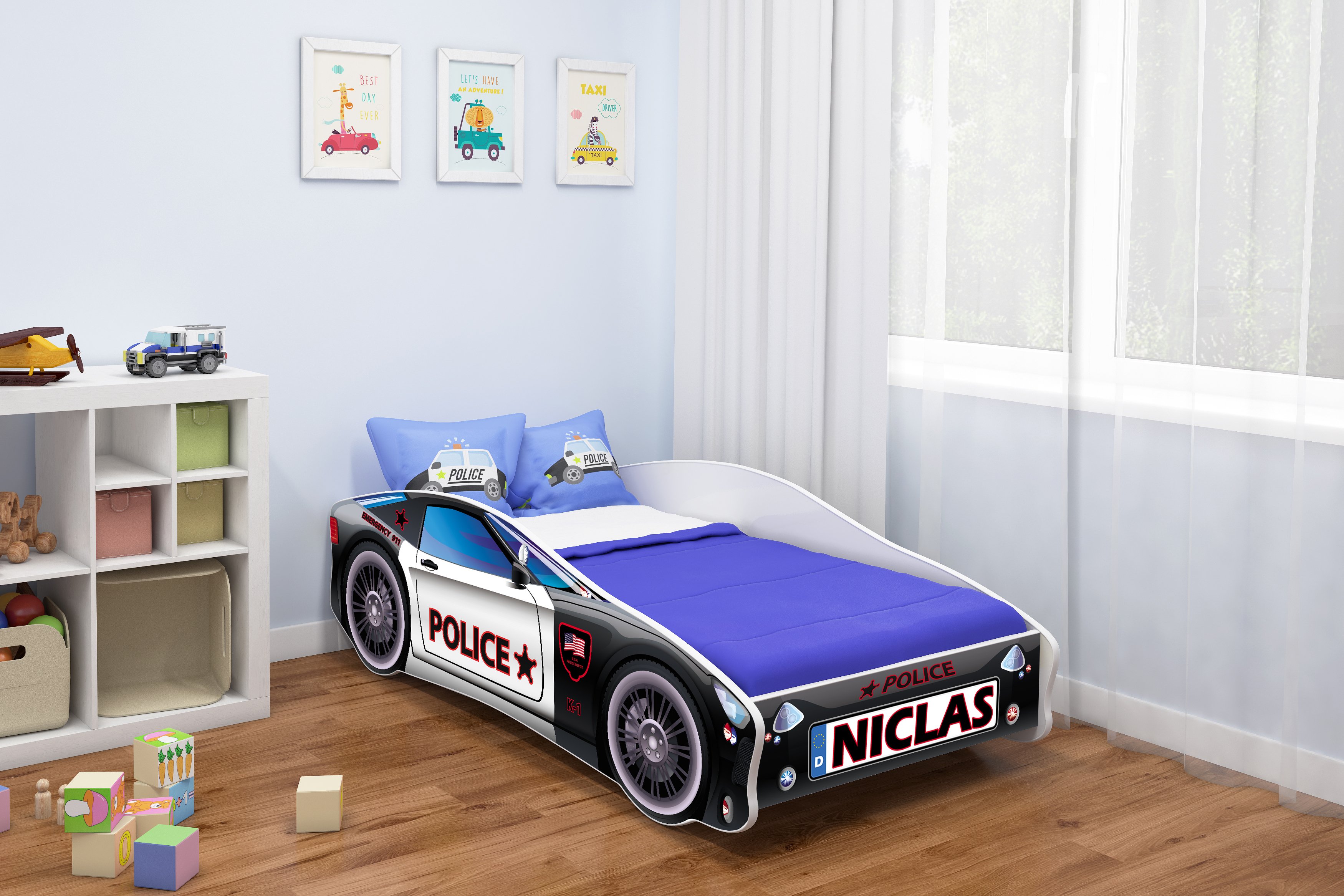 ACMA lit d'adolescent lit d'enfant lit de voiture Junior Cars lit set complet avec matelas sommier à lattes et protection contre les chutes 140x70 cm - Police -1 + NOM
