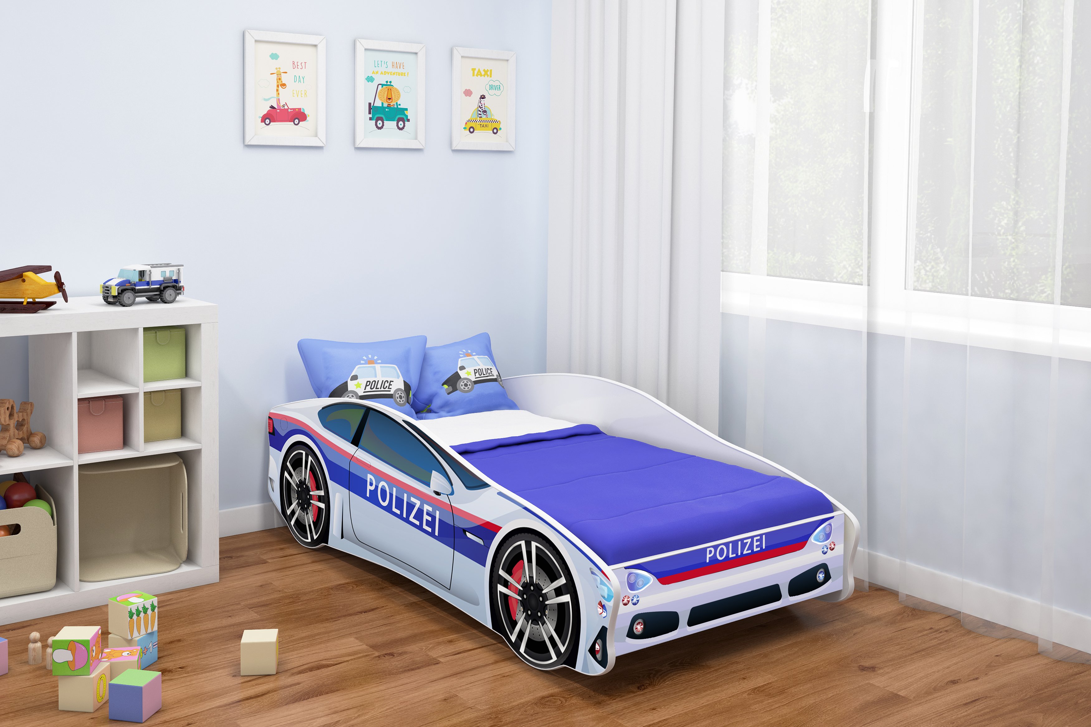ACMA lit d'adolescent lit d'enfant lit de voiture Junior Cars lit set complet avec matelas, sommier et protection contre les chutes 140x70 cm - police -3 + NOM
