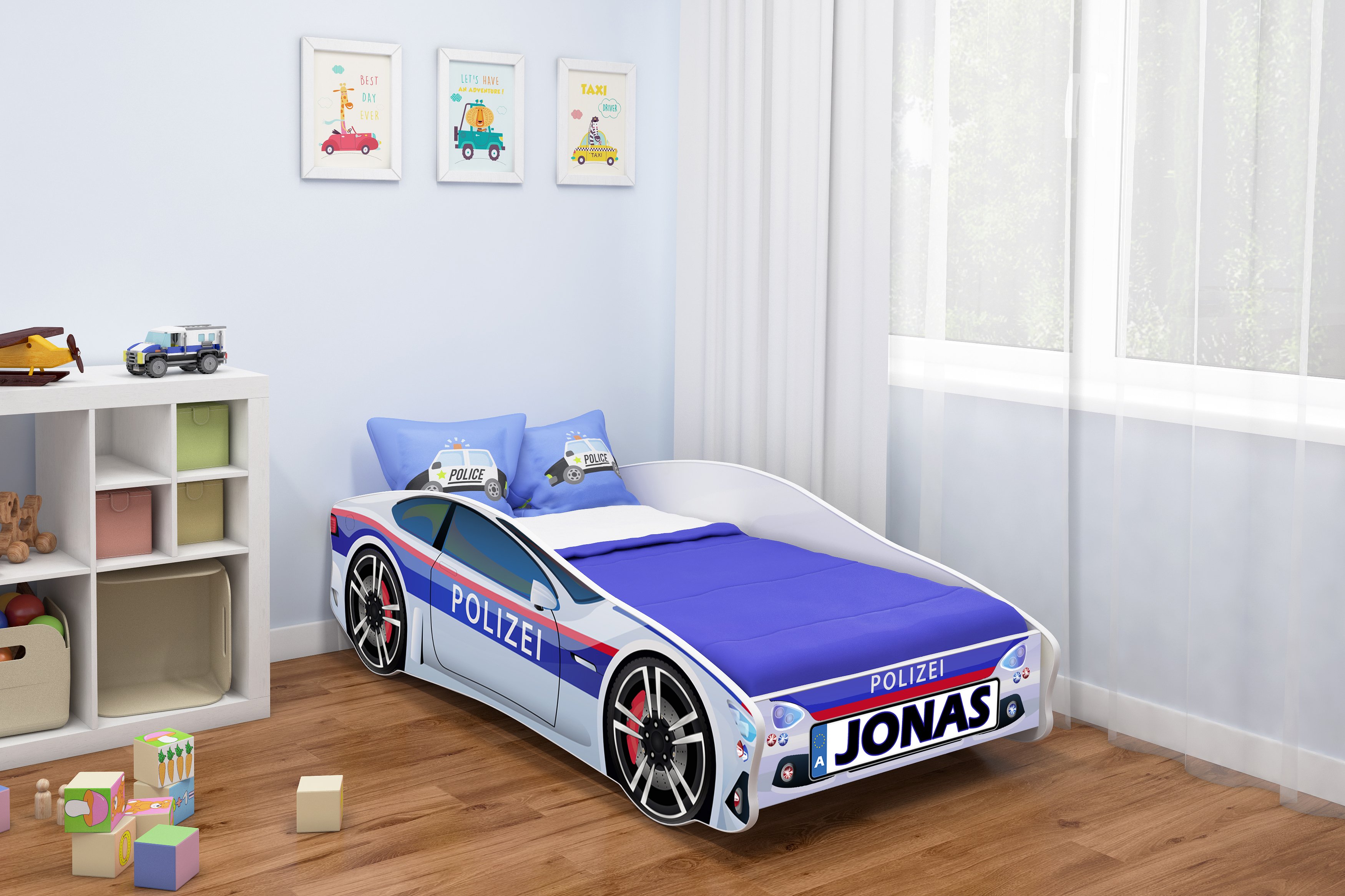ACMA lit d'adolescent lit d'enfant lit voiture Junior Cars lit set complet avec matelas, sommier et protection contre les chutes 160x80 cm - Police -2 + NOM