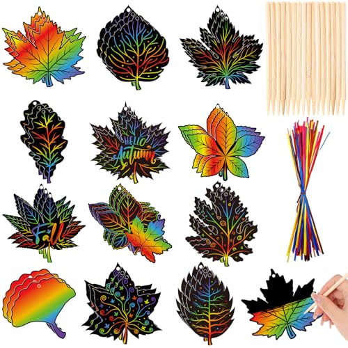 HOWAF 36 Pièces Activités Automne Enfants Feuille Automne Decoration Carte a Gratter Enfant Feuilles Automne Carte à gratter Papier Magique Feuille Dessin a Gratter Kit pour Bricolage automne enfant