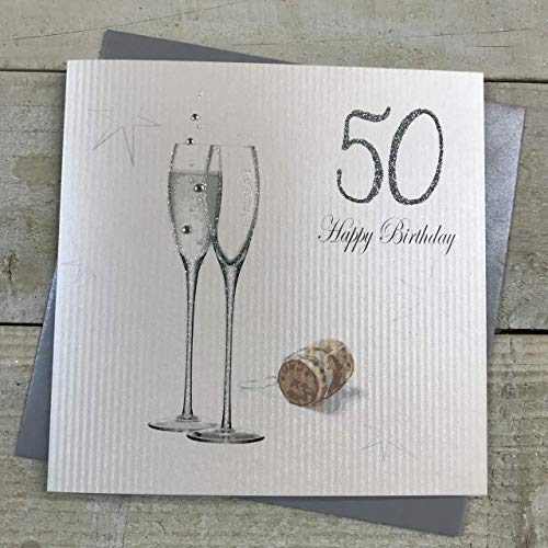 WHITE COTTON CARDS "50 Happy Birthday Fait Main Carte d'anniversaire 50 Ans avec Hologramme Champagne Design, Blanc