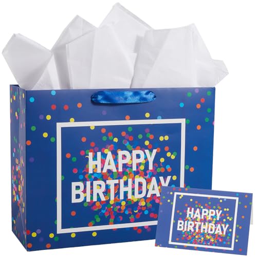 SOFPLATE 1 Lot de Sacs d'emballage Cadeau à Pois pour Anniversaire Grand Format Rectangulaire de 13x10 2x4 7cm Papier de Soie Carte de Vœux Bleu pour Ami Homme Femme Unisexe Fournitures de Fête et de