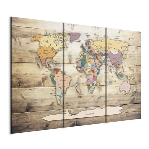 B&D XXL - Tableau décoratif Carte du monde 120x80 cm - Impression sur toile colorée - Décoration murale pour salon et chambre - Blanc marron vert - Bois continents cartes monde fond k-C-0035-b-f
