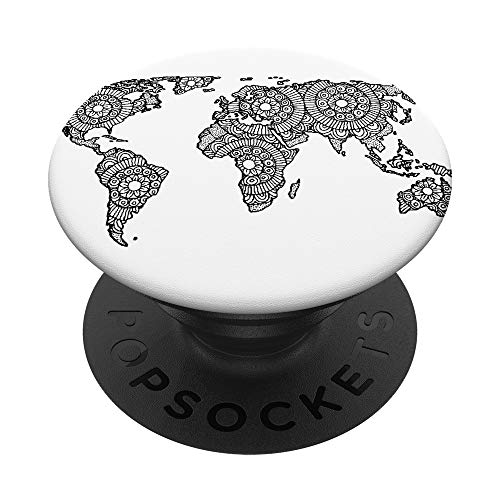 Monde Carte Noir blanc Esprit d'Aventure Voyage Mandala PopSockets PopGrip - Support et Grip pour Smartphone/Tablette avec un Top Interchangeable