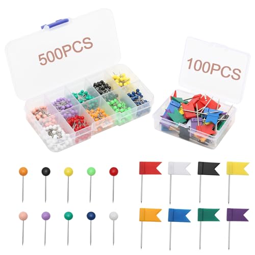 Lot de 600 Épingles Couleur pour Carte du Monde, Punaises à Tête Ronde et Épingles Drapeaux, Punaises de Carte pour Tableau en Liège, Tableau d'affichage