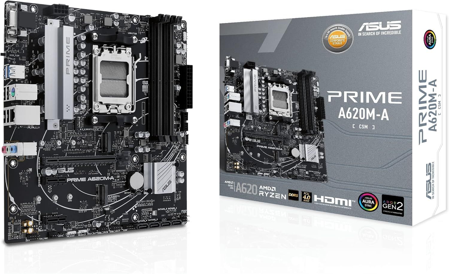Prime A620M-A-Csm¿Carte Mère Pro Amd Am5 A620 Micro-Atx (Ddr5,Pcie 4.0,2Xm.2,Displayport,Hdmi,Vga,Usb 3.2 Gen 1,Usb 3.2 Gen 1 Type-C En Façade,Sata 6 Gb/S,Aura Sync Rgb)