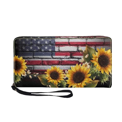 COEQINE Portefeuille fin en cuir PU pour homme avec fermeture éclair, porte-cartes et accessoires de voyage pour papa, anniversaire, jour commémoratif, Drapeau américain Tournesol, Décontracté