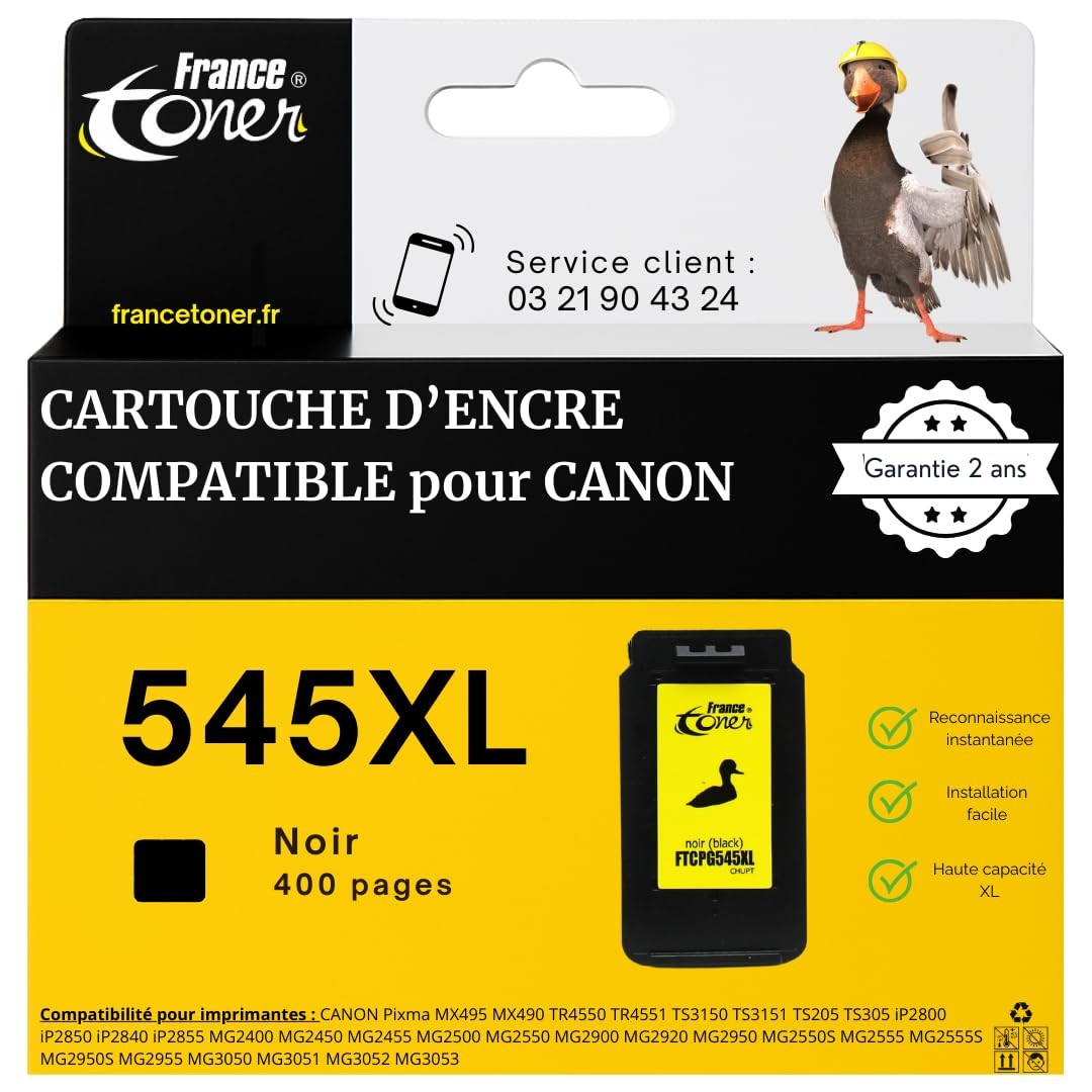 FranceToner - 545XL- Cartouche d'encre Compatible avec Canon 545 et PG-545 XL Noir - pour Imprimante MG2400 MG2450 MG2455 PIXMA IP2800 IP2820 IP2850 (545XL Noir)