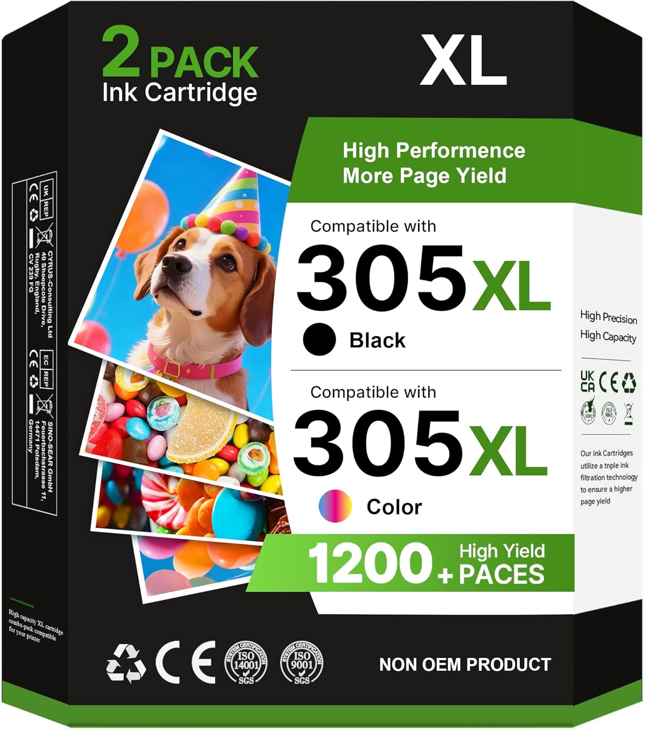 JEXNOVASHOP-305 XL Encre Compatible avec Cartouche HP 305 XL Noir et Couleur d'encre Multipack pour HP DeskJet 2710 2070e 2120 2721 2723 Envy 6010 6020 6022 6032 6020e Imprimante(2-Pack)