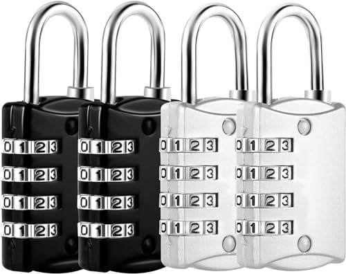 Lot de 4 Cadenas Code 4 Chiffres, Cadenas Valise Avion Petit Cadenas a Code College Métal pour Casier Bagage Gym (Noir, Argent)