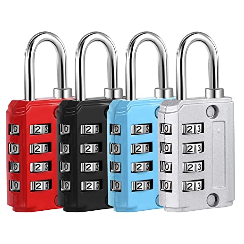 Lot de 4 Cadenas Code 4 Chiffres, Cadenas Valise Avion Petit Cadenas a Code College Métal pour Casier Bagage Gym (Argent Noir Bleu Rouge)
