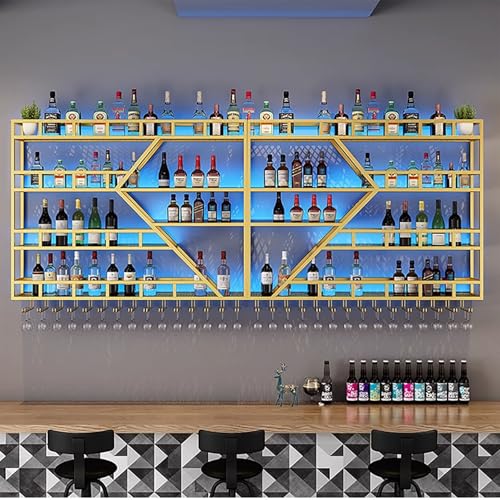 Casier À Vin Mural À LED Étagères De Bar Modernes Avec Support En Verre Casier À Vin Métal À 2/3 Couches Porte-bouteille Mural Industriel Pour Cave À Vin Bar Maison Cuisine(Gold blue light,180x123x20c