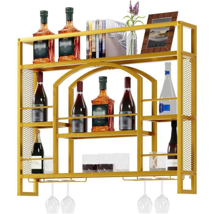 Casier à vin mural de style industriel,étagère flottante de bar avec lumières LED,présentoir à bouteilles de vin avec porte-verres suspendu,casier à vin en métal de grande capacité(Gold,100*20*70cm)