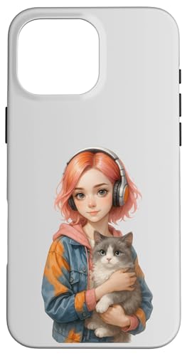 Kawaii Girl Casque Audio avec Chat Mignon Anime Streetwear Femme Coque pour iPhone 16 Pro Max