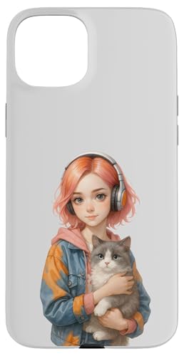 Kawaii Girl Casque Audio avec Chat Mignon Anime Streetwear Femme Coque pour iPhone 15 Plus