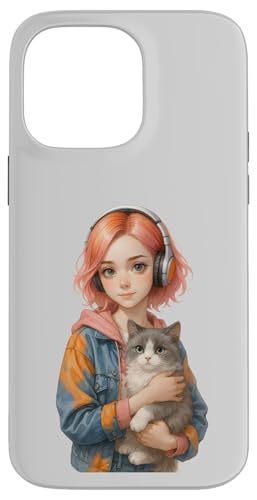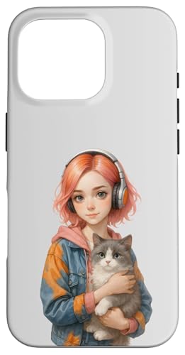 Kawaii Girl Casque Audio avec Chat Mignon Anime Streetwear Femme Coque pour iPhone 16 Pro