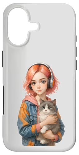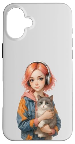 Kawaii Girl Casque Audio avec Chat Mignon Anime Streetwear Femme Coque pour iPhone 16 Plus