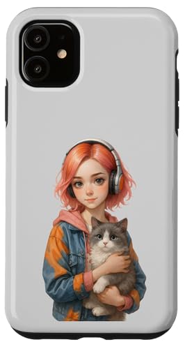 Kawaii Girl Casque Audio avec Chat Mignon Anime Streetwear Femme Coque pour iPhone 11