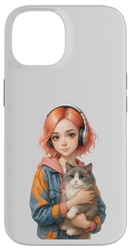 Kawaii Girl Casque Audio avec Chat Mignon Anime Streetwear Femme Coque pour iPhone 14 Plus