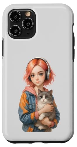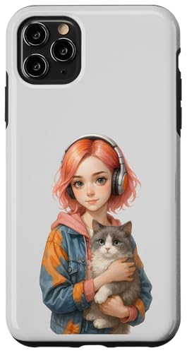 Kawaii Girl Casque Audio avec Chat Mignon Anime Streetwear Femme Coque pour iPhone 11 Pro