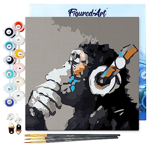 Figured'Art Mini Peinture par Numéro Adulte 20x20cm avec cadre Singe casque audio - Petit Format Kit de Loisir Créatif DIY Numéro d'Art Complet