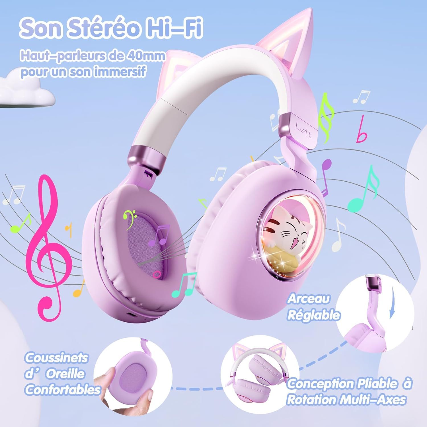 Casque Enfant Bluetooth Avec Oreilles De Chat Et Lumières Led \U2013 Casque Pliable Avec Limiteur De Volume 85Db \U2013 Sans Fil & Filaire Pour École, Voyage, Avion (Violet)
