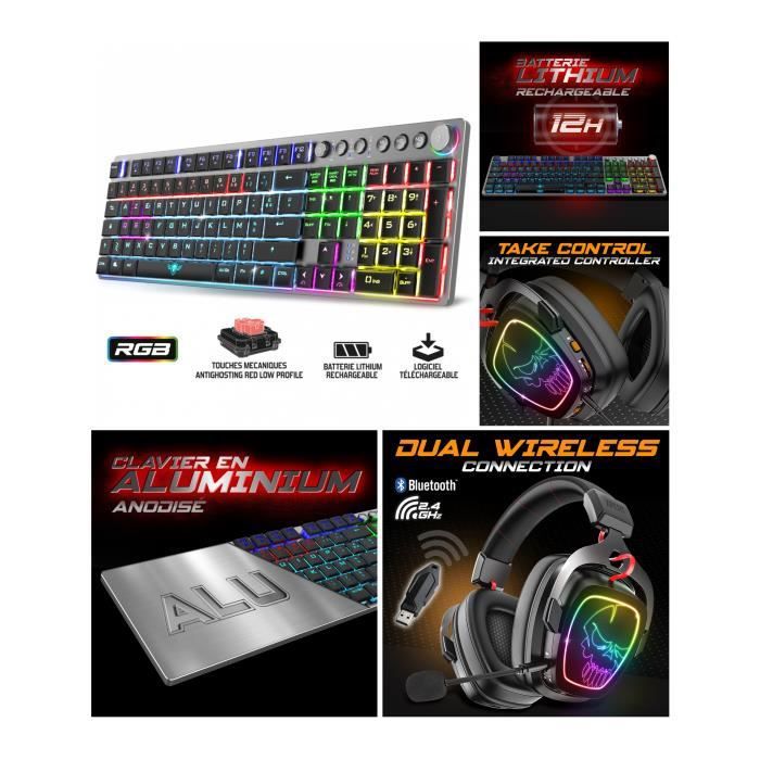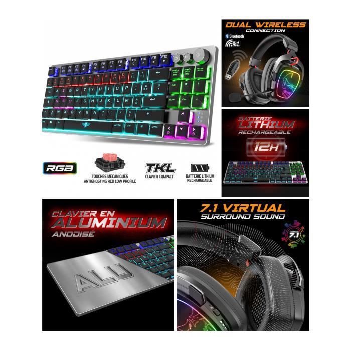 CLAVIER SANS FIL ALU RGB 2.4 GHz Bluetooth et filaire + CASQUE sans fil 7.1 pc Mac Switch Bluetooth Sans fil 2,4 GHz Connection PS4